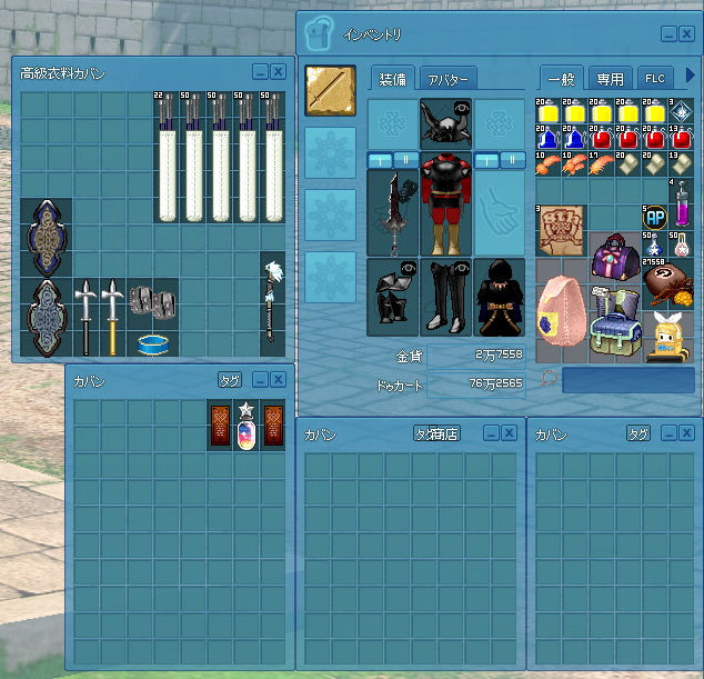 右上がメインインベントリ。下は右から順に追加カバン、ボーカロイドカバン、期限付きカバン。